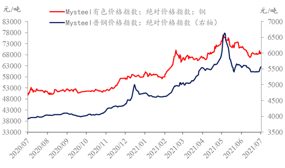 具體來看,6月鋼材消費(fèi)需求受高溫、雨季、汽車“缺芯”以及部分地區(qū)疫情反復(fù)等因素影響,五大品種表觀消費(fèi)量環(huán)比下降5.8%,但產(chǎn)量仍小幅增加,庫存連續(xù)三周累庫,總庫存環(huán)比增加76萬噸,鋼材基本面開始走弱,疊加國家相關(guān)部門監(jiān)管加嚴(yán),鋼價承壓下行;著眼有色金屬來看,銅價大幅下跌后,下游采購積極性有所提升,電解銅樣本庫存開始快速去化,但由于宏觀情緒轉(zhuǎn)淡,美指快速上行,在預(yù)期面以及匯率市場上對電解銅價格形成打壓,疊加銅礦供應(yīng)增加,電解銅成本支撐走弱,導(dǎo)致6月銅價震蕩下跌。