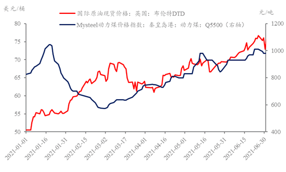 具體來看,本月原油價格大幅上漲的主要驅(qū)動力在于國內(nèi)外疫苗接種情況良好,市場信心有所提振、夏季出行高峰利好釋放,居民出行數(shù)據(jù)迅速上升以及海外各主要經(jīng)濟(jì)體制造業(yè)迅速恢復(fù),多方利好支撐下,原油價格迅速攀升;著眼動力煤價格,受夏季高溫天氣以及國內(nèi)經(jīng)濟(jì)形勢向好等因素影響,電廠日耗持續(xù)高位,動力煤消費(fèi)需求明顯增加;另一方面,由于7月重大節(jié)日的到來,6月國內(nèi)環(huán)保限產(chǎn)持續(xù)加嚴(yán),動力煤供應(yīng)量偏少,供不應(yīng)求的背景下,動力煤價格迅速上漲。