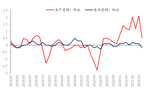 從PPI指數(shù)的構(gòu)成結(jié)構(gòu)來看,6月生產(chǎn)資料價格環(huán)比迅速下降,終端成本壓力將有所緩解,生活資料價格由于前期漲幅較低,故6月跌幅也較小。值得注意的是,PPI指數(shù)中生產(chǎn)價格指數(shù)的權(quán)重月74%,生活價格指數(shù)的權(quán)重僅24%,是6月PPI價格環(huán)比增速快速下行的主要原因。